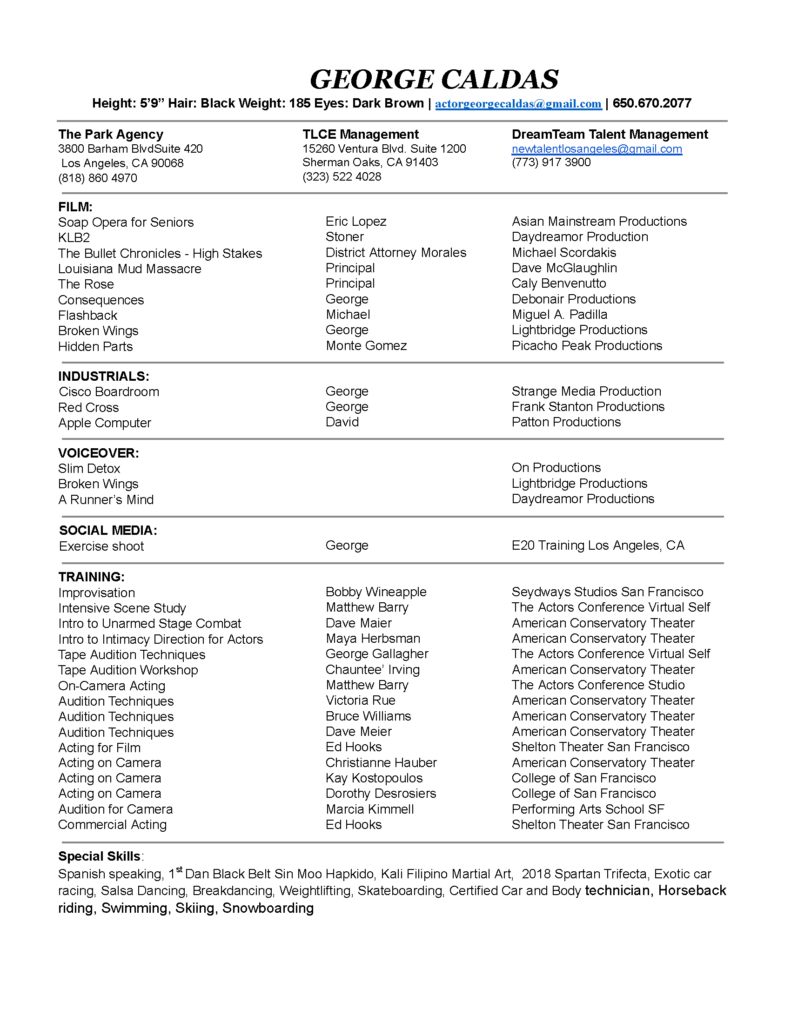 "George Caldas has been a regular member of my ongoing acting class for the past 2 years. In that time he has been an inspiration for others in the class in the way he has pushed himself to grow and stretch as an actor and as a person. His combination of strength and vulnerability, along with his openness to taking direction, enthusiasm for trying out new things, and powerful on-camera presence makes him a joy to work with."